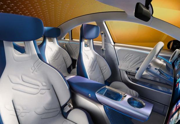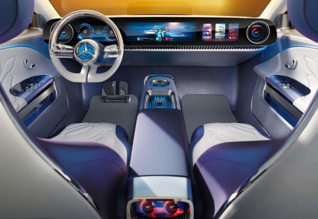 Дизайнът със смръщените фарове и новият прочит на предната “решетка” (която при електромобилите вече не е решетка) са доста различни от всичко друго, което сме свикнали да виждаме от един Benz, макар да са далече от серийния модел. В интериора има гигантски екрани и възобновяеми материали – точно каквото бихте очаквали от един уважаващ себе си прототип през 2023 г.