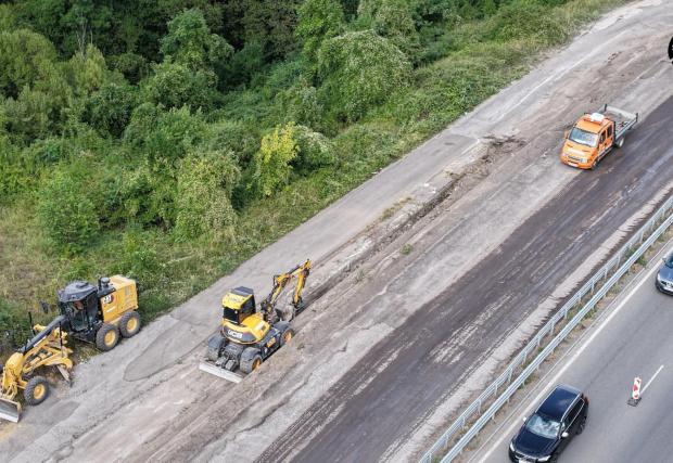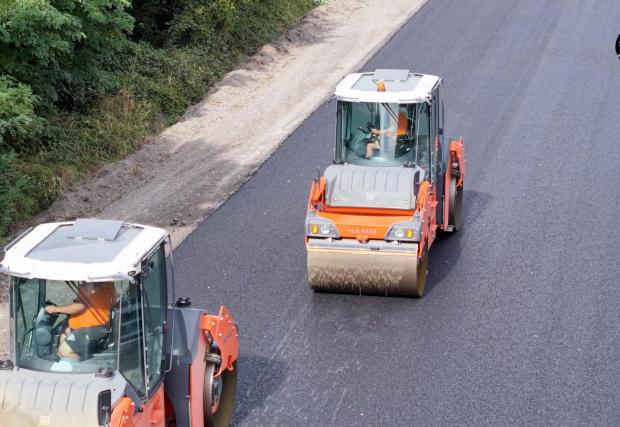 Ремонтът на стария път между София и Перник през Владая тече с пълна сила. Кадри и видео от дрон от канала SkyPoint показват, че в едното платно вече се поставя първи слой асфалт и се редят бордюрите.