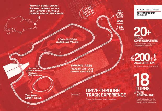 Той ще позволи както на собственици, така и на фенове на марката, които нямат собствено Porsche, да карат най-новите модели на компанията на писта. Трасето ще бъде с дължина 2 км и цели 20 конфигурации, като ще позволява скорости над 200 км/ч и минаване с пълна газ на двете прави. Безспорно най-готиният елемент е тунелът: колите минават през самата сграда на комплекса. Както може да се очаква, ще има и дрифт трасе с диаметър 80 метра.