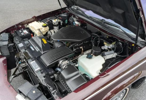 Седанът е рядък екземпляр с пробег около 11 хиляди мили и фабричния 5,7-литров V8, оценен на 260 к.с., комбиниран с четиристепенния автомат 4L60-E и пакет за теглене с подсилено охлаждане и крайно предавателно число 3,42. Задвижването е към задните колела, а конфигурацията е подбрана именно с мисъл за караваната.