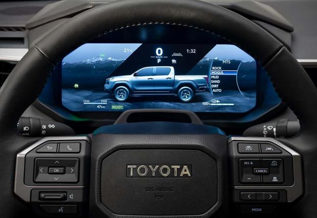 Новият Hilux въвежда по-семпло табло с до 12,3-инчов цифров приборен панел и централен мултимедиен екран (до 12,3”), групирани офроуд контроли и свързани услуги през приложението MyToyota, включително дистанционни функции и телеметрия за фирмени автопаркове. Пакетът Toyota Safety Sense е допълнен с Low Speed Acceleration Suppression, Proactive Driving Assist и Emergency Driving Stop, а нови системи като Blind Spot Monitor и Safe Exit Assist са налични според нивото на оборудване.