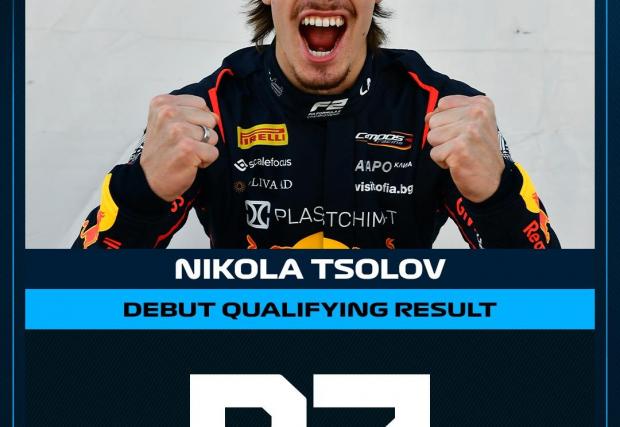 Никола Цолов направи впечатляваща първа квалификационна сесия във Формула 2. Българският лъв се класира седми, като изпревари много от по-опитните пилоти, включително съотборника си Арвид Линдблад, който вече има 12 кръга от сезона зад гърба си, но ще стартира 17-и. Постижението е впечатляващо, като се има предвид, че Цолов днес за първи път се качва в болид от F2, след като завърши сезона във Формула 3 като вицешампион.