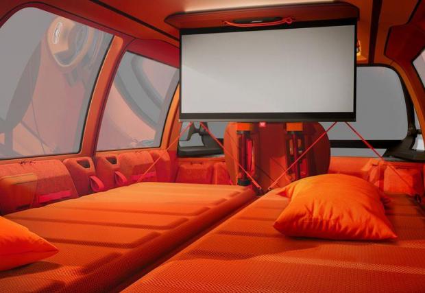 Хитрите детайли в интериора не се ограничават с това. Хедъп дисплей прожектира информация на под предното стъкло, а воланът е вдъхновен от този на “богинята” DS. Седалките могат да се свалят и да се използват за пикник, включително шофьорската! А на мястото на задните могат да се поставят две надуваеми легла. За тази цел на борда има компресор. При този вариант от тавана се спуска платно за прожектиране на филми. Става и за миниатюрен офис – шофьорската седалка може да се трансформира в мъничко бюро.