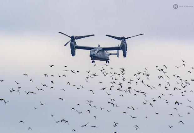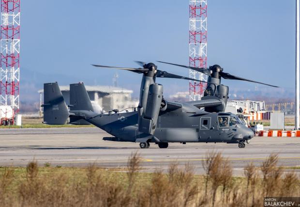 Авиоспотърите на летище “Васил Левски” засякоха един от най-странните военни самолети в света. В неделя (14 декември 2025) Bell Boeing CV-22B Osprey спря у нас само за презареждане, но очаквано предизвика интерес. Самолетът е на американските военновъздушни сили и е един от малкото в света, които позволяват както хоризонтално, така и вертикално кацане и излитане. Проектиран е да съчетава функционалността на хеликоптер и самолет. Това става с помощта на завъртащи се на 98 градуса двигатели.