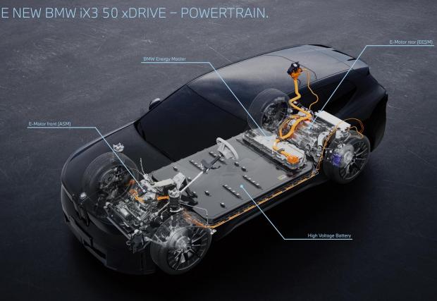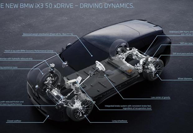 Задвижване. Много промени и тук. Моделът дебютира само в една единствена версия iX3 50 xDrive, с два мотора – асинхронен отпред, със 167 к.с. и 225 Нм и синхронен отзад – още 326 коня и 435 Нм. Общо разполагате с 469 к.с. и 645 Нм, които са доста повече от 286-те коня на предишното iX3, макар че прякото сравнение на двата модела не е особено коректно, поради големите новости при най-новото 6-то поколение eDrive задвижване. Въпросните ел. мотори са собствена разработка на BMW и се сглобяват в Грац, Австрия, в общ корпус с управляващата електроника и предавателната система, което ги прави по-леки отколкото ако не бяха обединени по такъв начин. Самата батерия не може да се нарече лека - около 570 кг., макар, че конструкцията ѝ е интересна и би следвало да е спестила малко от маса, защото клетките не са обединени в няколко модула, а са поместени директно в метален корпус, който реално е конструктивен елемент, под/дъно на автомобила. Представете си, че седалките са завинтени директно за обшивката на батерията, защото е точно така.