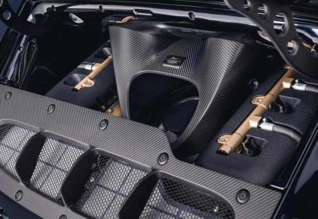 За екстериора клиентът е избрал Fantasia Blue цвят, покриващ карбоновите панели и цвят „шампанско“ за кованите магнезиеви джанти, които са с диаметър 19 инча отпред и 20 отзад, обвити в Michelin Pilot Sport Cup 2. Зад тях седи и мощна карбон-керамична спирачна система.