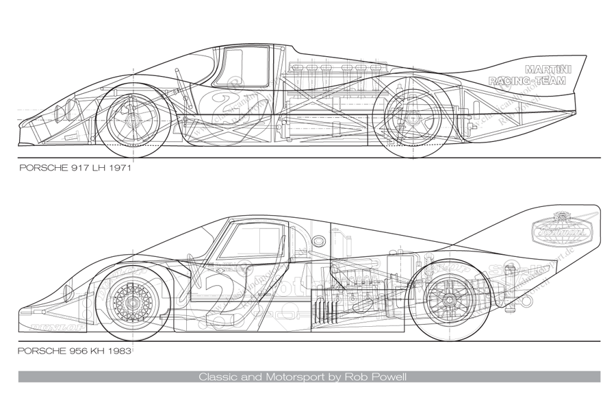 Както всички шестцилиндрови боксерни състезателни двигатели, описаният в първата част на тази поредица двигател на Ханс Мецгер (проектиран за първото Porsche 911 през 1963 година) става първооснова и на двигателя на 956. Блок картерът е базиран на този на двигателя на първото Porsche 911 Turbo (930), но модифициран за състезателни нужди. Както и при серийните двигатели шпилките са изработени от Dilavar, а процесът на изработване на титановите мотовилки е същият като при турбо двигателите за Формула 1 TAG Porsche и ще се използва малко след това за 959, чийто двигател е конструктивно близък до този на 956 и 962.