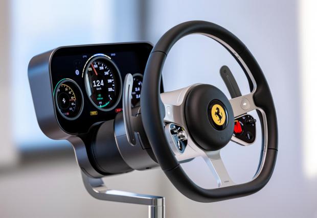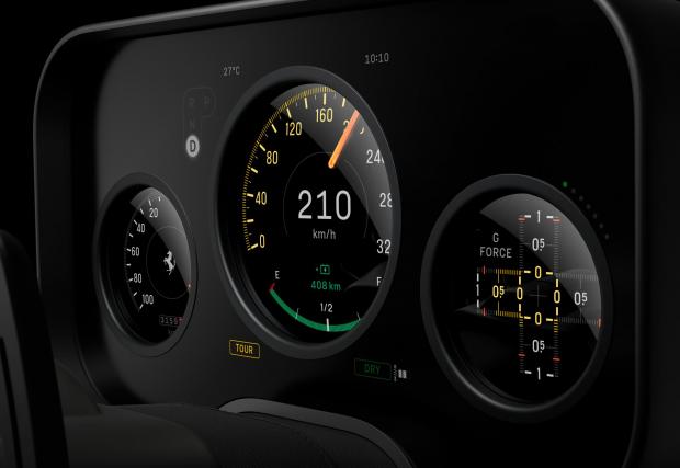 Панелът зад волана много прилича на табло с аналогови уреди, вдъхновени както от класическите Ferrari-та с техните прибори Veglia и Jaeger, така и от авиацията и часовникарството. Основните му компоненти са два дисплея поставени в различни равнини, OLED панели, за разработката на които са полагали специални усилия хора от Samsung. Реално трите кръгли отвора в горния дисплей, обрамчени с бордове от анодизиран алуминий, отварят „поглед“ към долния дисплей.
