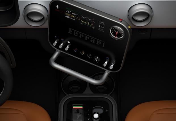 Подвижен е и централния дисплей, закачен с ябълковидна връзка за таблото, така че да може да се ориентира свободно или към водача или към пасажера. Друга забележителност при него е истинският часовник горе вдясно, който Ferrari наричат „мултиграф“. Този уред освен да показва часа, явно може да служи за хронограф, да се превръща в компас и индикатор на функцията лаунч контрол. „Произведение на изкуството на микро инженеринга“ пишат още в прессъобщението. Изглеждащото супер класически уредче си има три собствени електромотора, движещи стрелките автономно.