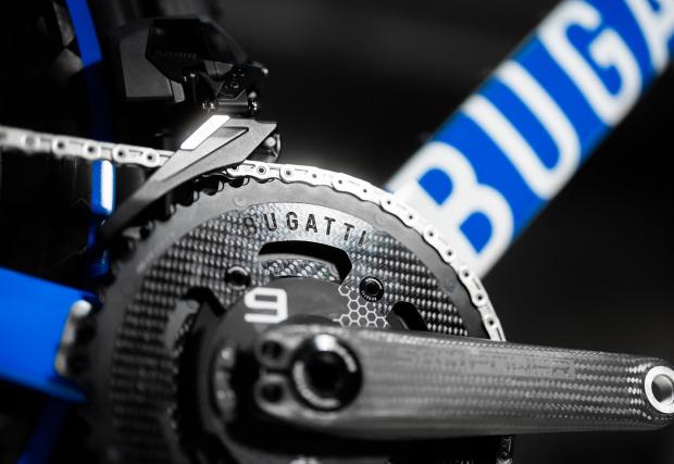 Гумите са Continental, но също специално направени за модела и брандирани с надпис “BUGATTI”, който се среща навсякъде по колелото, включително и на средния венец, който е карбонов и дело на италианската Carbon-TI. Вилката пък е допълнително аеродинамично оптимизирана и намалява съпротивлението с около 2 вата, казват от Bugatti/Factor Bikes.