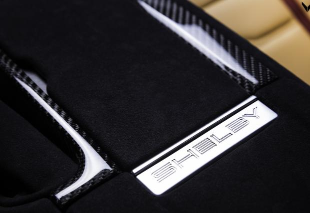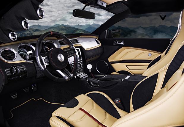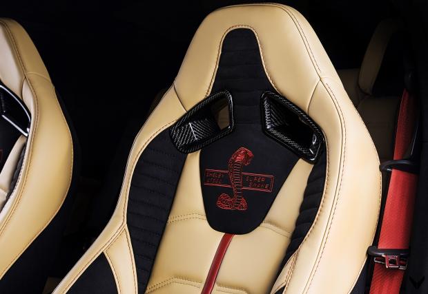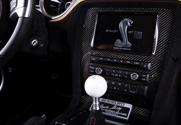 В интериора непроменени остават единствено сребристият панел на таблото и лостчетата на вратите и топката на скоростния лост, всичко друго получава „20th Anniversary“ внимание, като обаче оригиналната плочка със серийния номер е оставена непокътната. Респект към произхода. Повърхностите са покрити основно с бежова кожа, черна алкантара и лакиран карбон. Дори кутията на кормилната колона е облицована с алкантара, както и тунелът на трансмисията, част от корите на вратите и седалките. Последните са получили нова „Shelby GT500 Super Snake” бродерия, а над нея – карбон за отворите за спортните колани. Въпросната бродерия е изпълнена в червен цвят, който се повтаря от предпазните колани, ивиците на седалките, контрастиращите шевове по корите на вратите и таблото, както и от централния маркер на волана.