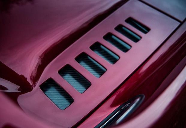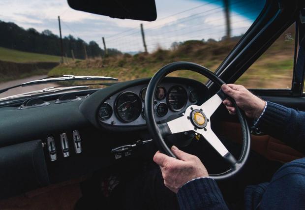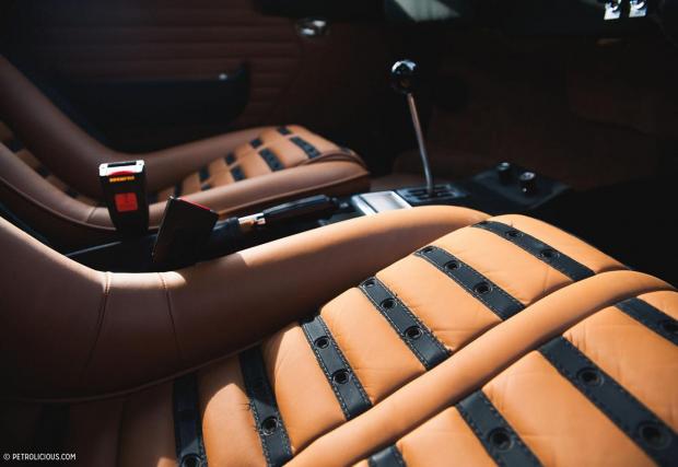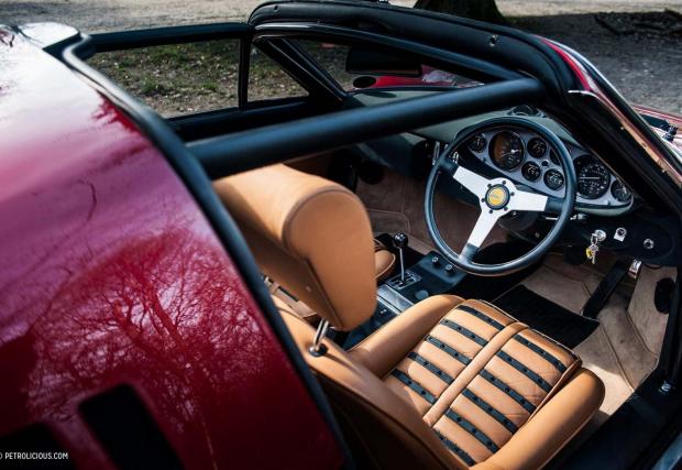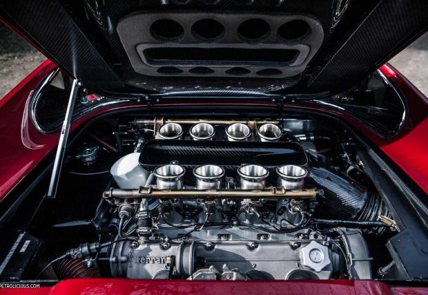 И този човек се казва Кевин, британец, който се занимава с реставрация и който очевидно не винаги държи на оригиналността в смисъла на това колата да бъде запазена в стоковия вид. Иначе, какво по-оригинално от Dino, чийто 2,4-литров V6 е оставен в работилницата за да бъде заместен от 3,2-литров V8 от Ferrari 328. Дроселите пък са от 355, кутията на въздушния филтър е изработена от карбон, както и капакът на самия моторен отсек. Приказка.