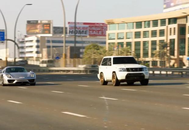 Бруууутааалеееен! Тези от вас, които са гледали последния 13-ти епизод на The Grand Tour веднага познават машината. А за тези, които не сте, само ще кажем, че Хамънд бе унижен зад волана на мощното 887 к.с. Porsche 918 Spyder, което вдига сто от място за 2,6 секунди, в драг гонка. От тази кола, видимо Nissan Patrol Safari…
