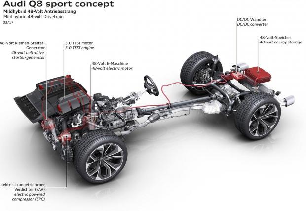 Основният агрегат е 3.0 TFSI с 450 к.с., който се пълни от две турбини и компресор с електрическо задвижване. Последният вече работи серийно в SQ7, а тук помага за още по-ефективното задвижване. Колата разполага и с малък електромотор вмъкнат между коляновия вал и трансмисията, отдаващ допълнителни 26 к.с. и 170 Нм, при рязко натискане на газта. Машинката служи и за връщане на енергия, когато колата се плъзга плавно, а „спечеленото“ електричество отива в литиево-йонната батерия отзад.