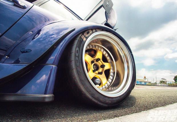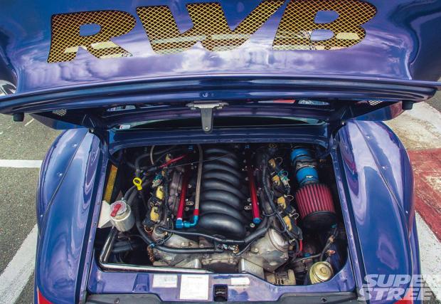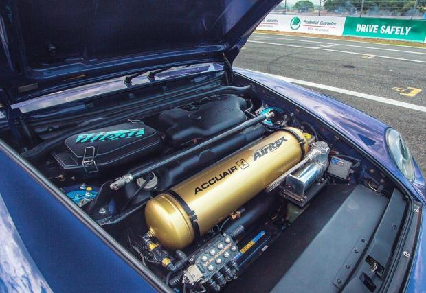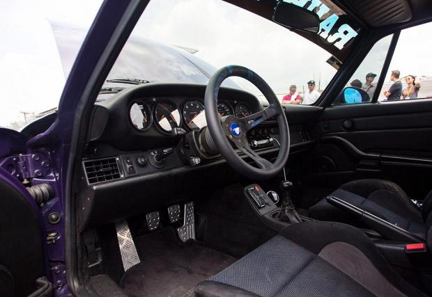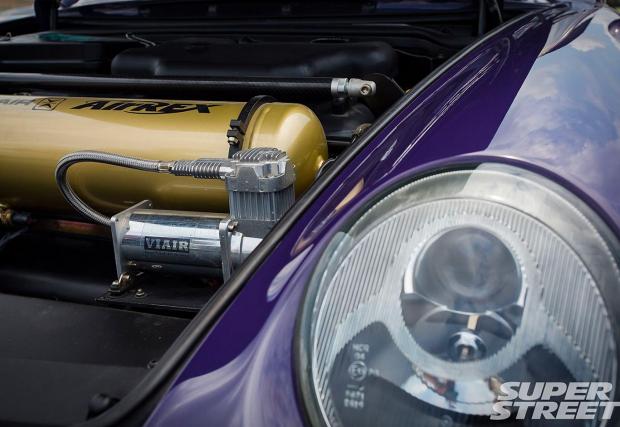 В конкретната конфигурация лилавата му 993-ка разполага със скромните 340 к.с., но Иън обмисля вариант да смени LS1-ичката с LS3-ка с 540 коня. Трансмисията е ръчна G50 на Porsche, но с някой модификации. Окачането също е различно от това на всички RWB-та досега – то е сменено с въздушни елементи на Accuair, а Иън командва височината на своето 993 през iPhone-a си.