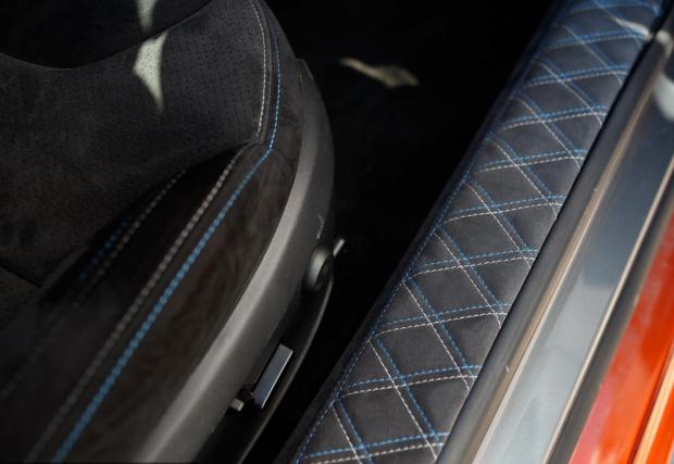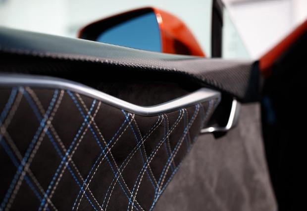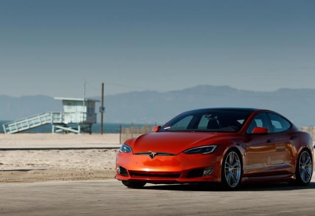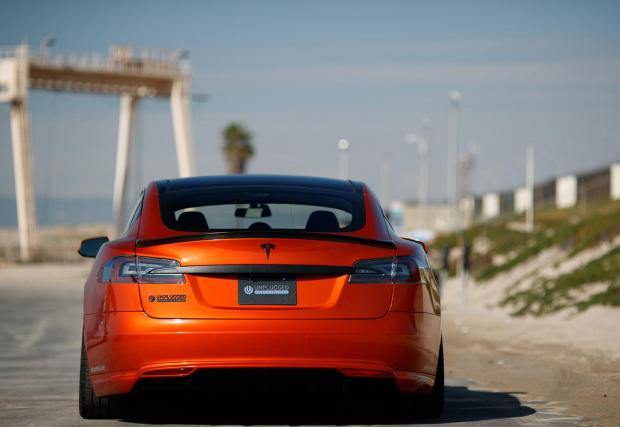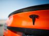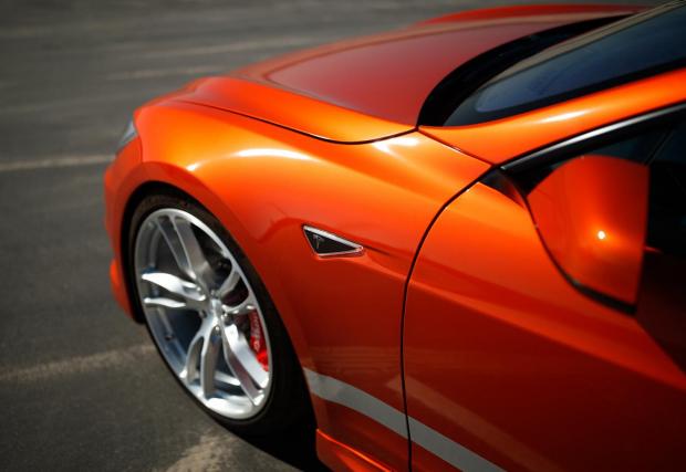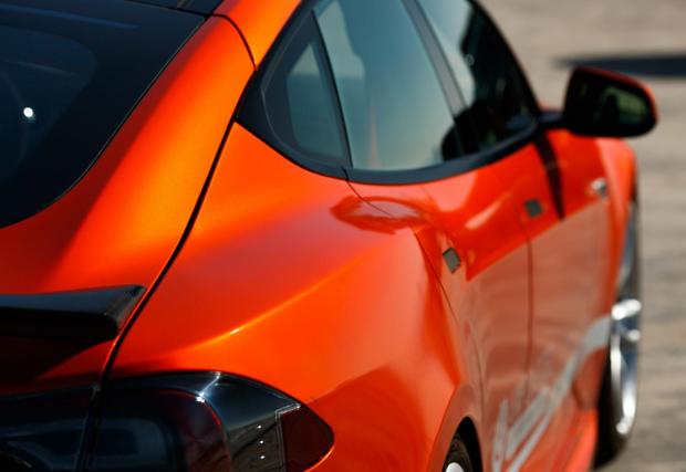Друго? Автомобилът седи по-ниско благодарение на преместените нагоре крепежни елементи на оригиналното въздушно окачване, което променя доста визията на Model S. Добавено е яко оранжево, знаете че харесваме този цвят, карбонови елементи отвън, като най-сериозно е преработен салона – също елементи от карбон и готини парчета алкантара.