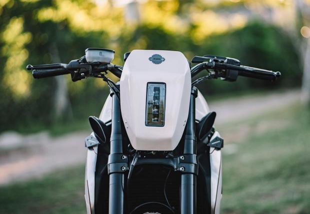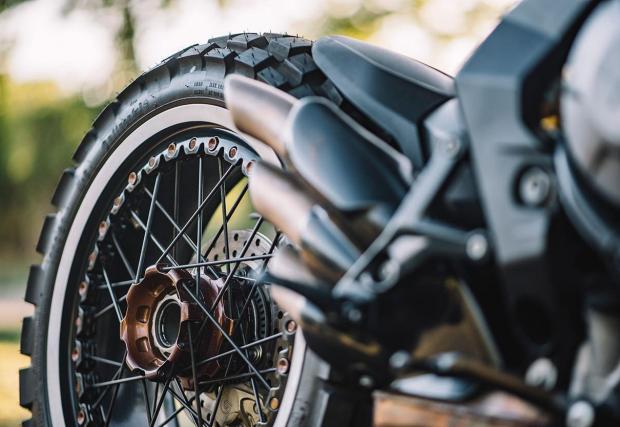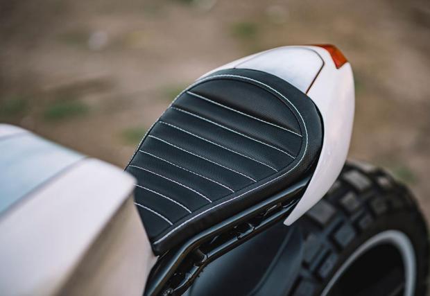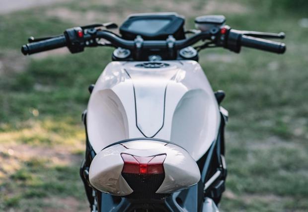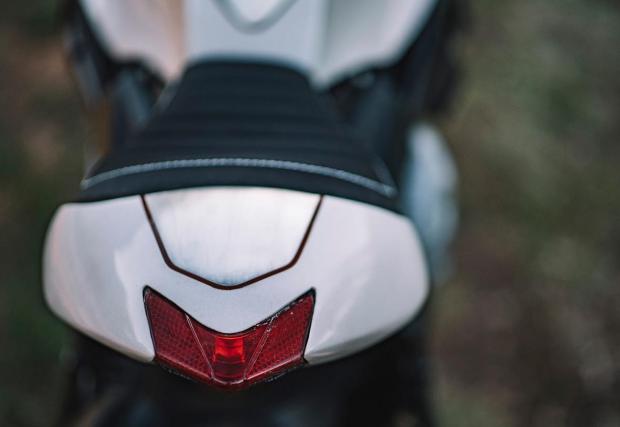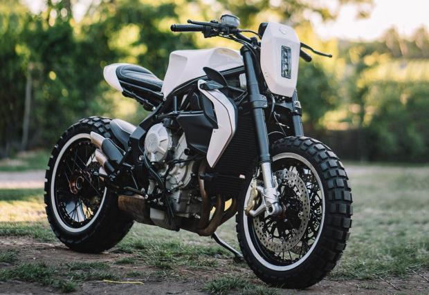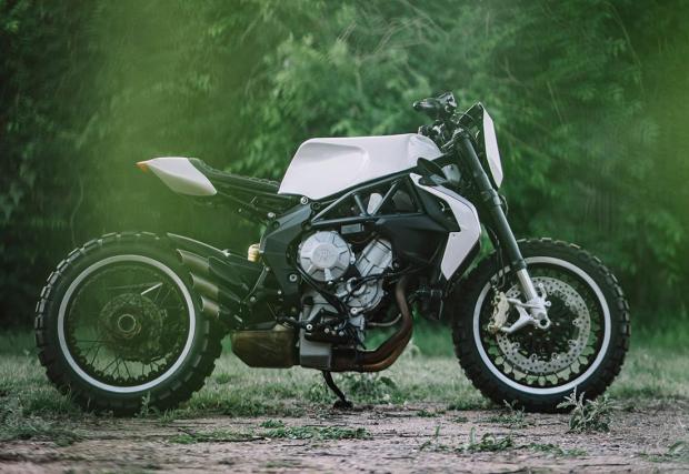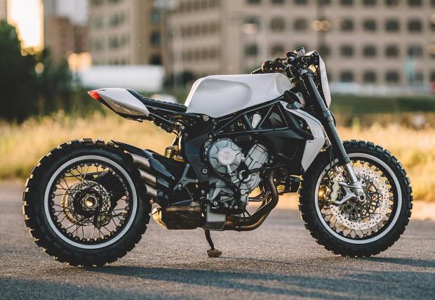 По-запознатите с гамата на MV Agusta може би ще забележат, че супер яките колела не са стандартните. Дамите ги взимат от модификацията Dragster, пребоядисват ги и ги обуват в яките Conti TKC80. Отпред е монтиран LED фар от JW Speaker, огледалата са Rizoma, а капачката на резервоара от Ducati 748. Резултатът? Виждате го на снимките, супер готин и умерен байк, парите от който ще отидат за едно добро дело.