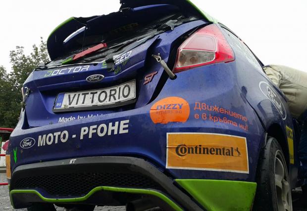 През цялото време Виторио караше много тактически, давайки постоянни времена, но и съобразявайки се с възможностите на напълно стоковия си автомобил и липсата на разнообразие от гуми. За жалост, на новия за състезанието етап „Лазарци“, който беше трети поред за днешния ден, малка грешка прати Fiesta-та в страни от пътя, удряйки дърво със задната част на автомобила. По думите на Виторио, на много бърз десен завой, задницата на колата е поднесла изведнъж заради хлъзгавия асфалт и той не е имал никакво време за реакция. За щастие обаче, той и баща му Христо са добре, а пораженията по автомобила са нищожни и то само козметични, което означаваше само едно – те продължават като успяват да избутат автомобила сами заради липсата на публика в този участък.