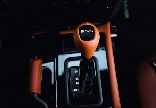 За целта Vilner разкостват салона до метал, полагат допълнителна шумоизолация (през която сме убедени, че продължава да се чува характерния само за G 55 мега готин тътен), обличат седалките във фина кожа с перфорации с G логото и го сглобяват обратно. Основен мотив са шахматно разположените перфорирани G-та – собственикът обичал интелектуалната игра с фигурките, както и... шоколада “Ritter Sport”, двата източника на вдъхновение ползвани от българското арт студио, оттам диагоналното разположение и оформените, като блокчетата на десерта... блокчета. Сладка и интелигентна работа.