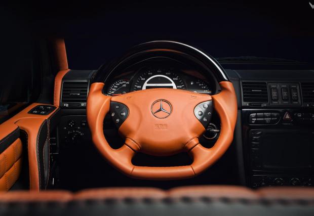 Що се отнася до таблото, то не само е облечено в черна кожа, а между нея и оригиналните повърхности е поставена мека подложка, което придава по-луксозен вид, както и прави работите по-готини на пипане. Таванът пък е глътнал няколко квадрата алкантара, предимно кафеникава, като само в задната част е черна, което подобрявало гледката в огледалото за обратно виждане. Воланът? Черен пиано лак, ергономичен обръч и кафява кожа. Любопитен детайл при точно тази кола е, че макар и карана във Великобритания, българинът – да, този G 55 е на нашенец – е предпочел да управлява от лявата страна, само километражът е разграфен в мили.