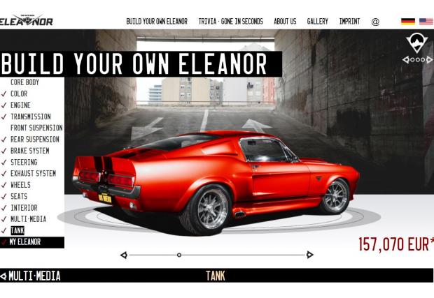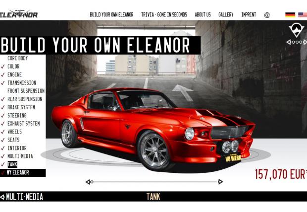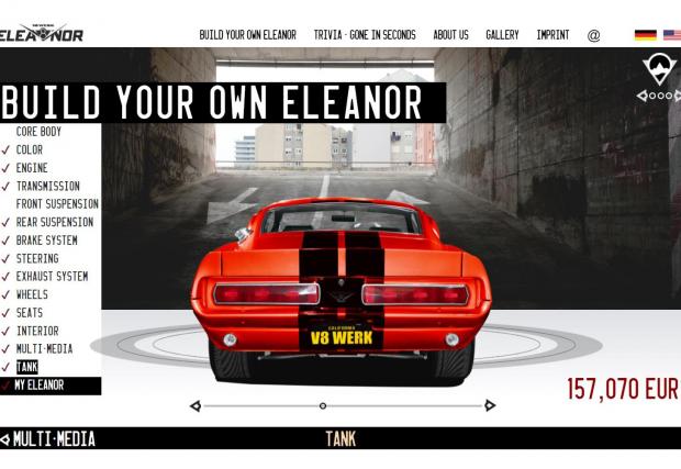 Ателието се казва V8 Werk, екипът му обича да ровичка по Ford Mustang и Corvette MkV, а самия гараж се намира в Алтенберг, Саксония. V8 Werk предлагат изработката на ‘Eleanor’, като в сайта им дори има конфигуратор. Колко яко може да бъде?! Много. Можете да си „сглобите“ култовия автомобил през телефона, таблета или компютъра, след което да си свалите ‘MY ELEANOR’ селекцията в pdf формат. Тази функциоанлност съществува и в сайта на Porsche, но V8 Werk е нано производител в сравнение с тях, така че отдаваме респект на вторите немци за сайта и отношението към потенциалните им клиенти.