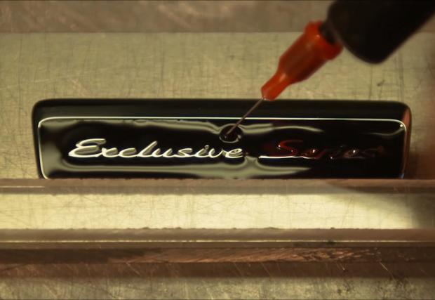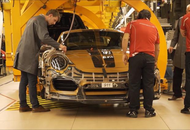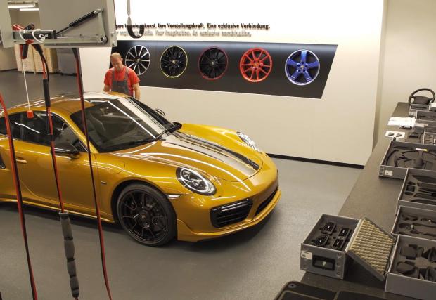 Видеото проследява производствения процес на 911 Turbo S Exclusive Series, не само най-мощното Turbo S в историята на Porsche, но и най-ексклузивното. Както ще видите, вниманието към детайла присъства във всяка фаза от създаването на колата. Любопитно ни беше да видим процеса на боядисване на джантите: полага се базов златист слой, после черна боя, която в последствие се прогаря с лазер за да се покажат златните контури. Дори малките табелки “Exclusive Series” с поредния номер на колата се боядисват на ръка.