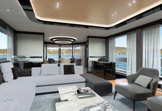 Визията на GTT 115 (Grand Turismo Transatlantic) е вдъхновена от електрическата концепция Porsche Mission E, а вътре и на палубата могат да бъдат забелязани възглавнички с “houndstooth” тапицерия, напомняща на 911 R… Интериорът има също старателно положен мрамор и карбон, вторият явно не с цел олекотяване, а от естетически съображения, имайки предвид наличието на първия материал. Екипажът се състои от 6 човека, толкова е капацитетът и за гости.
