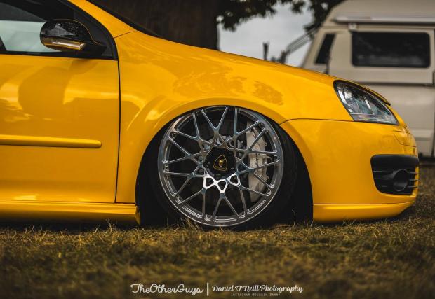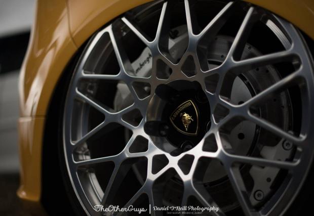 При това не на кое да е Gallardo, а на Lambo Gallardo LP 560-4, най-якото изпълнение на модела, с най-готините джанти не само за марката, но и сравнени с доооста други. Джанти, които биха седели прекрасно и в хола със стъкло отгоре, а спирачките – интересно колко промени е направил човека, за да пасне системата на този Golf V.