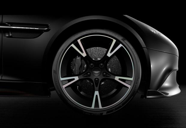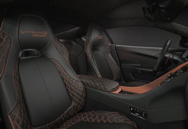 А именно с няколко надписа ‘Ultimate’, карбонови елементи отвън, като например апликациите при страничните решетки в калниците. Карбо-керамични са и спирачките, джантите са специални за модификацията, а цветовата гама отдава почит към първото поколение Vanquish S Ultimate Edition – черно с черно, още черно и черно, и малко бронзово.