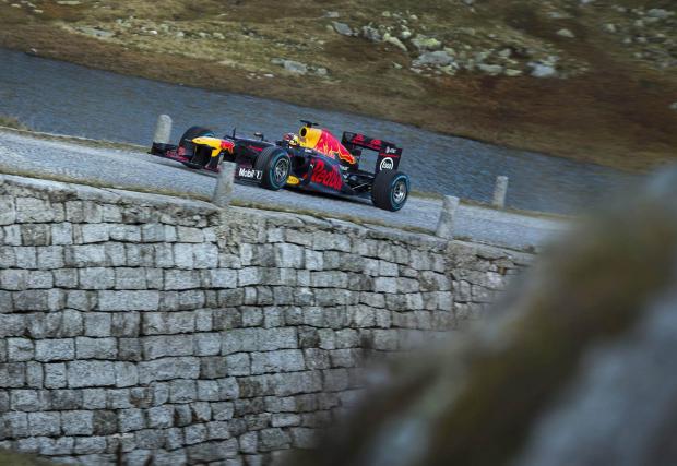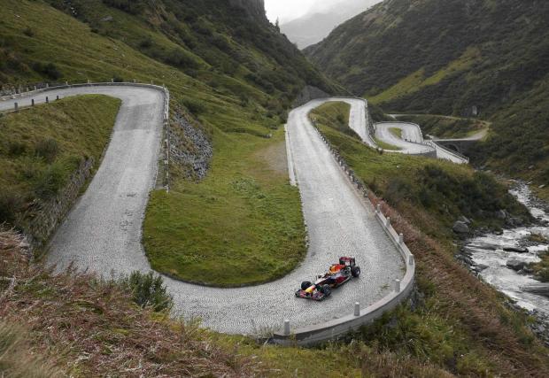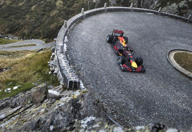 Добре де, всъщност е само един болид, но и това е достатъчно странно. Обикновено сме свикнали да виждаме служебната кола на Макс Верстапен на стерилната настилка на състезателна писта или в краен случай по улиците на Монако. Но в Алпите?