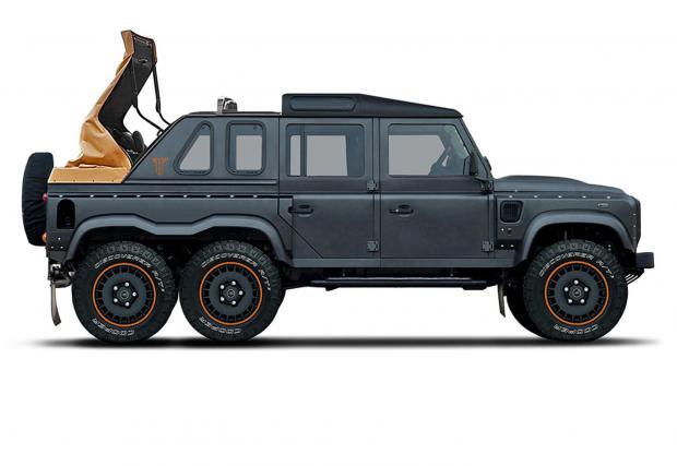 Без всякакво съмнение в класацията ни за десетте най-луди коли на 2017 (все още я допълваме) своето място ще намери Mercedes-Maybach G 650 Landaulet. Явно обаче идеята за всъдеход ландолед е допаднала на платежоспособните клиенти, защото тунинг ателието Kahn Design подготвя свое виждане по темата. За основа ще бъде използван триосен Defender, а готовият продукт ще се казва Flying Huntsman 6x6 Soft Top. Тук освен от споменатия G 650 вдъхновение очевидно е черпено и от G 63 AMG 6x6.