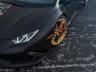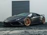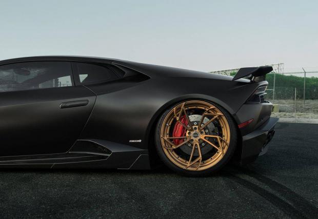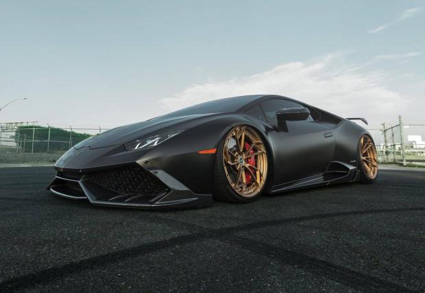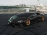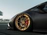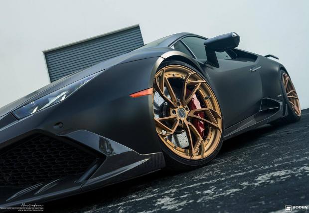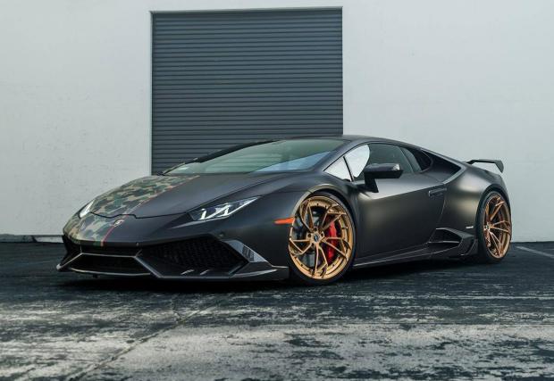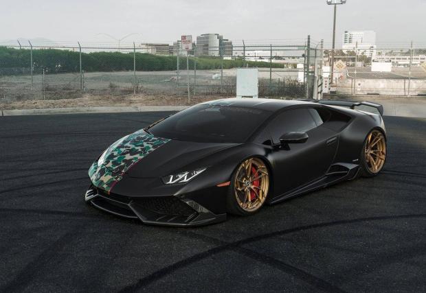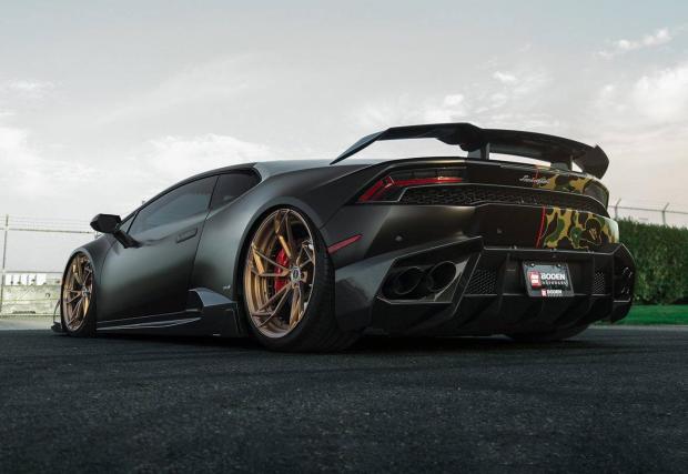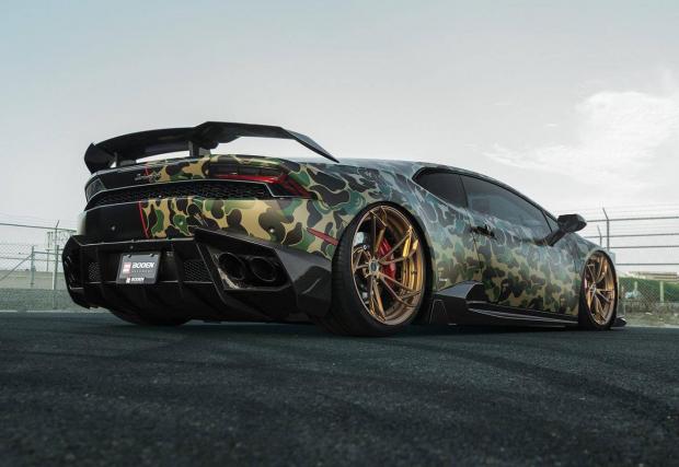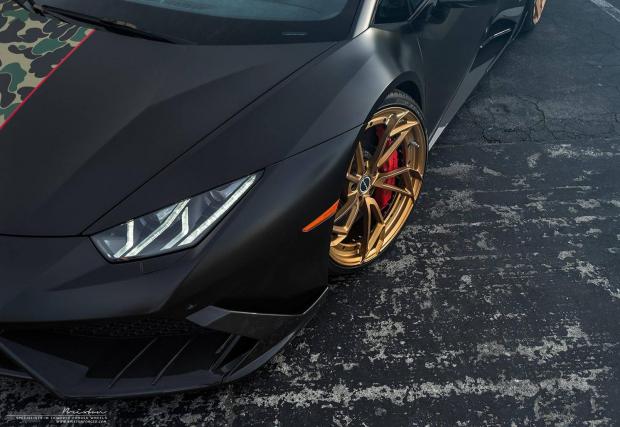 В случая обаче имаме ‘stance’ кола, чиято основна цел е да рекламира продуктите на Brixton – марката на джантите. Конкретните златни колела са от модела PF1 Duo Series и изглеждат доста… приятно. Huracan-ът е модифициран с карбонов аеро пакет, но по-интересното е „двойното“ решение на екстериора – лява страна в черен мат; дясна в камуфлаж.