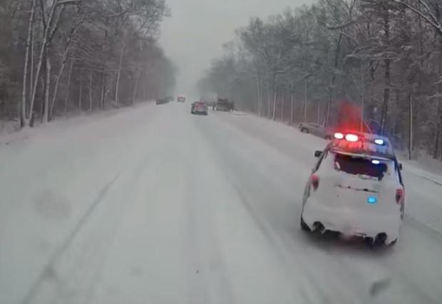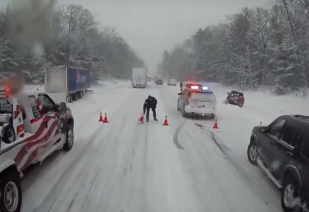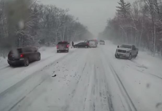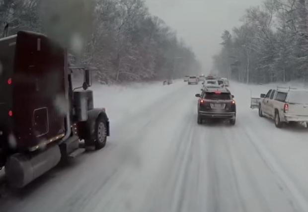 Кадрите са от борда на камион на пътна помощ, отзовал се на сигнал на 26 декември по шосе №31 в северната част на Щатите. Сериозните снежни бури в щата Мичиган не са рядкост и шофьорите обикновено са добре подготвени. За съжаление големите 4х4 пикапи може и да са много полезни при потегляне в преспите, но почти по никой показател не превъзхождат коя да е друга кола, когато става въпрос за спиране на заледен и заснежен път.