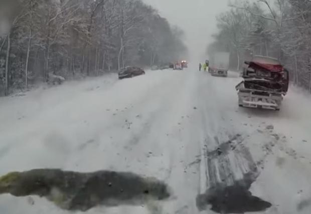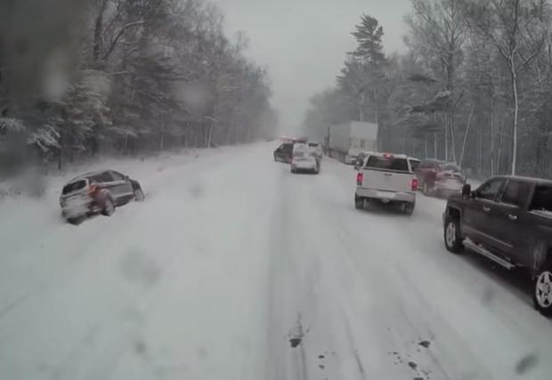Ситуацията вероятно ще ви се стори позната - пътят все още не е почистен и канавките се оказват неочаквано привлекателни. В мелето участват поне 20 коли и камиони (в тези няколкостотин метра, които виждаме в клипа), като за щастие няма данни за сериозно пострадали хора.