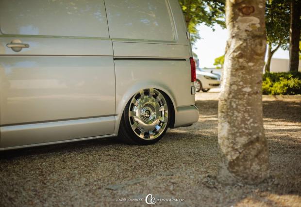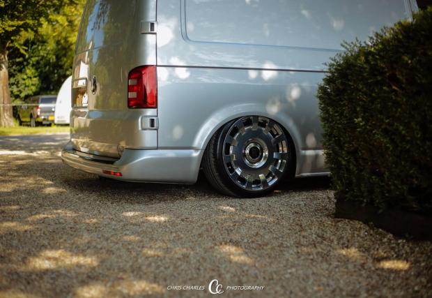 Този конкретен VW T6 предлага на собственика си (и неговите заобикалящи) лукса да си налее една мента с газирана вода и да отпусне гръб на полираната RR 20-ка, чиито лагеруван център държи двата инициала във винаги коректна позиция. Макар, че на дали притежателят на този ван консумира точно такива питиета. А и същият вероятно ползва качествени столчета за почивките си.