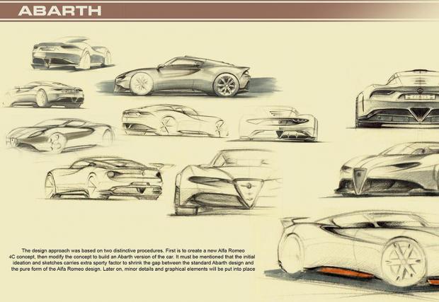 Ако вземете оригиналната Alfa 4C Concept от 2011 и пренесете идеята ѝ в 2018, ще се получи нещо подобно на колата от тези скици. Независим дизайнер си представя по този начин тунингована от Abarth версия на машината. Видими са някои елементи от Giullia, но определено е имало влияние и извън концерна FCA. Bugatti Chiron, към теб гледаме!