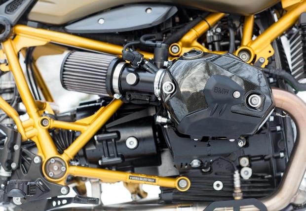 Панелите, които така или иначе не са много, също са пипнати. Шведът подрязва предния калник и слага слюда Wunderlich. Стъпенките Gilles Tooling осигуряват добро сцепление за краката, а предпазната плоча Hepco & Becke пази долната част на 1200-кубиковия боксер от недоброжелателни камъни. Капаците на главите покрива с карбонови части от HP серията на BMW, а изпускателната система е титаниева Akrapovič.