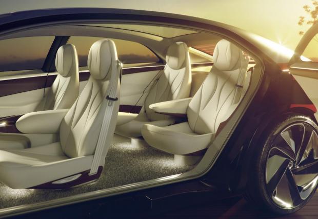 Огромният VW се простира на дължина от 5,16 метра и има междуосие, сравнимо с това на дългата S-класа – 3,09 метра. За сравнение – джантите са 24-инчови. Футуристичният интериор е по-изчистен от този на Tesla, включва холограми, система за гласови команди и резервни механични джойстици, в случай, че системата за разпознаване на гласа ви откаже…