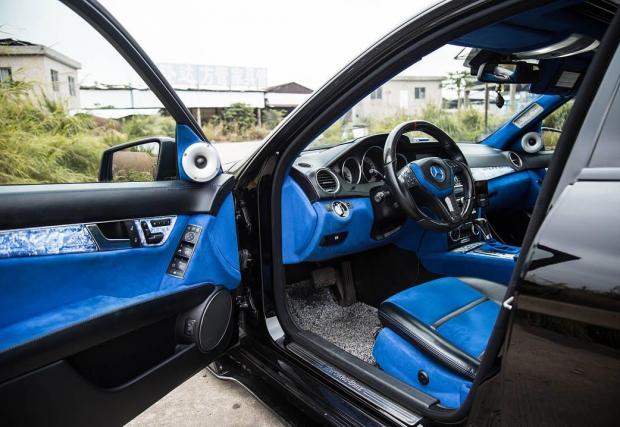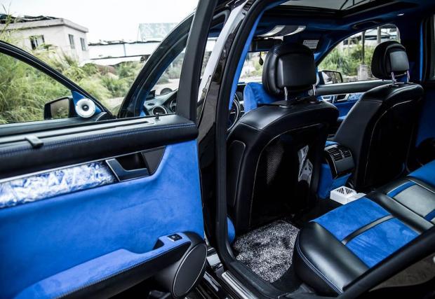Брутален и непрактичен Merc C 63 AMG T-Model на въздух. Интериорът е син