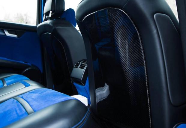 Освен, че багажникът е станал на практика неизползваем, колата седи и много ниско. Окачването обаче е въздушно, така че това може да се коригира на ход. Аерото говори само за себе си, както и салонът – брутална комбинация от черна кожа и синя алкантара. Апликациите по таблото и вратите също са прекалени, но не за всеки.