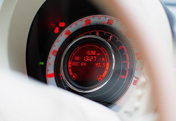 Fiat 500: Доказателство за красотата, която се крие в минимализма. Преследващи се стрелки на оборотомера и скоростомера. Ужасни за четене, но много красиви.