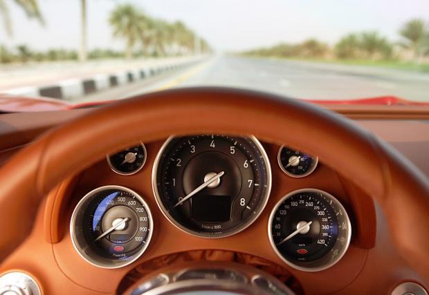 Bugatti Veyron: Скоростта е нещо второстепенно във Veyron, който поставя оборотомера на централно място, а вляво от него - показателя за използваната в момента порция от тези апетитни 1001 к.с.