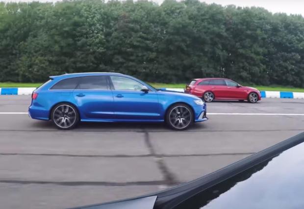 Разбира се, тогава остава моменталното достигане на върхов въртящ момент при електрическата кола. Така че конкуренцията трябва да има много коне и нютони. В случая това са BMW M760i (битурбо V12 с 610 к.с. и 800 Нм), Mercedes-AMG E63 S комби (4-литров V8 с 612 к.с. и 850 НМ) и Audi RS 6 Performance (4-литров V8 с 605 к.с. и 750 Нм при бууст). Видеото е 360-градусово, което е добра възможност да го гледате няколко пъти. Ясно се вижда, че шофьорът на Tesla-та не прави най-доброто потегляне, но това не се отразява зле на състезанието, напротив... Във всеки случай много апетитен квартет с труден за прогнозиране изход.