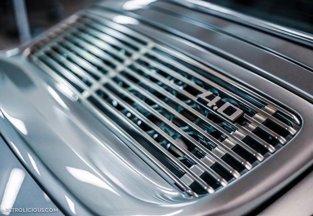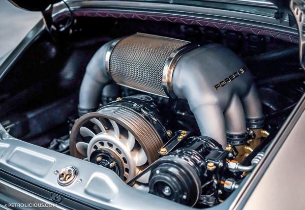 Цветът е жесток! „Повечето немци избират черното с черен интериор, исках да съм по-различен“. Този ‘Singer’ е боядисан в ‘Lunar Silver’ и определено му седи прекрасно. Двигателят е 4-литровият атмосферен мотор, който сам по себе си е произведение на изкуството. Вижте само златните надписи ‘PORSCHE’.