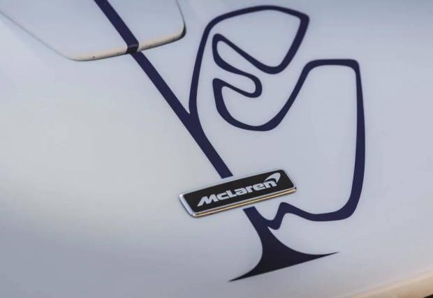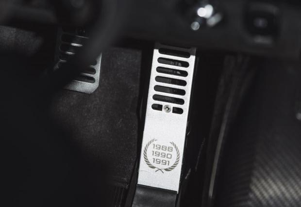 В случай, че се чудите - двата цвята на каросерията са Anniversary White и Aurora Blue. 600 часа са били нужни на екипа, за да подготви преливането на цветовете. Обърнете внимание и на други ефектни детайли - например на педала на газта са поставени годините на световнити титли, спечелени от Айртон Сена.