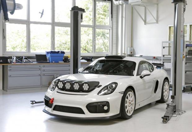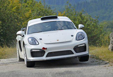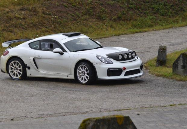 Porsche тества кола на WRC терен. Автомобилът е базиран на Cayman GT4 Clubsport, а пилот е Ромен Дюма