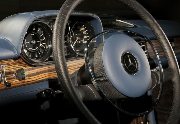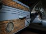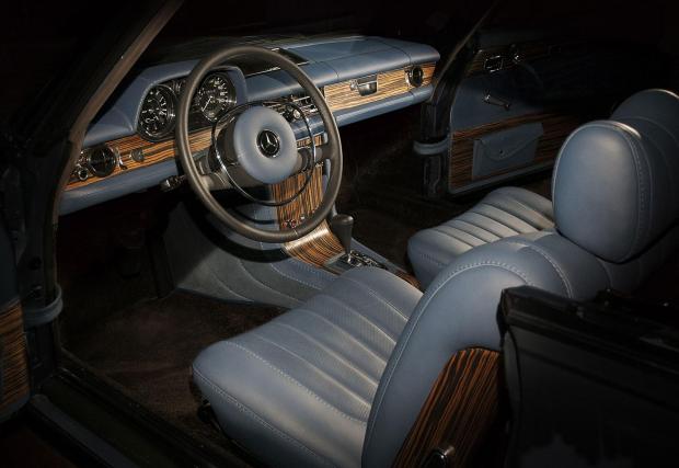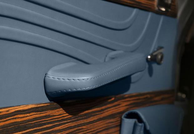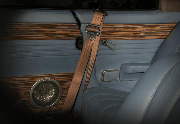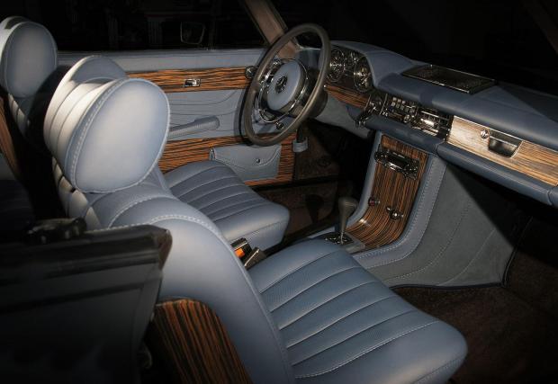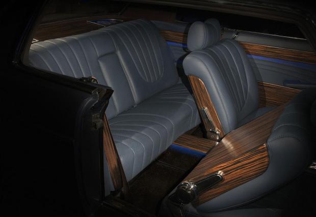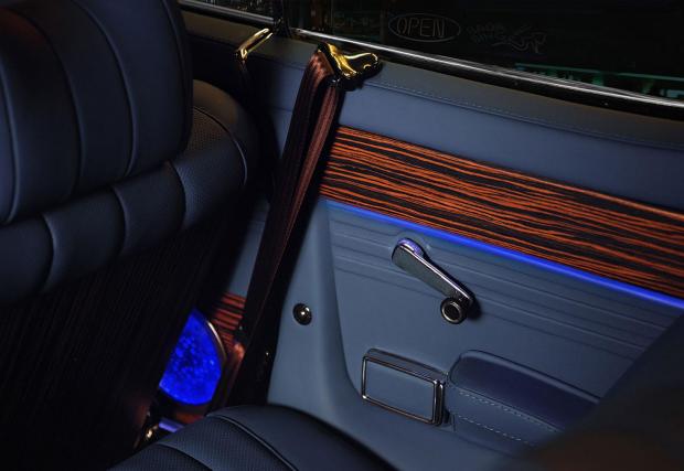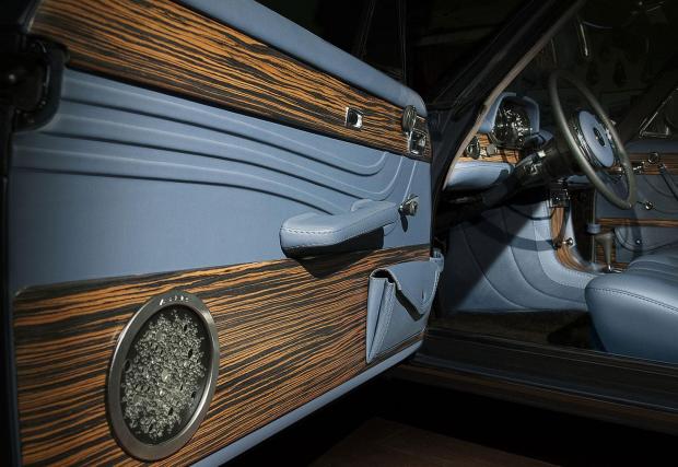 Задачата не е лека. Автомобилът е транспортиран по море, а остатъците от дървесината са допълнени с нова от същия тип и орех, пресовани във фурнир, за да могат да бъдат положени в автомобила. Резултатът е впечатляващ, без да бъде натрапчив, а идеята салонът да бъде максимално класически, с едно изключение – стерео системата и амбиентното LED осветление. Докато сърцето на музикалната инсталация е маскираният, като старо радио супер съвременен Becker Mexico, решетките на говорителите са изработени от перфориран лексан и сияят в синьо.