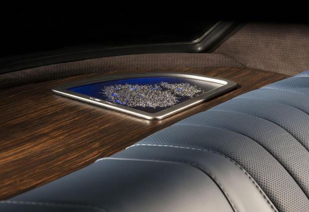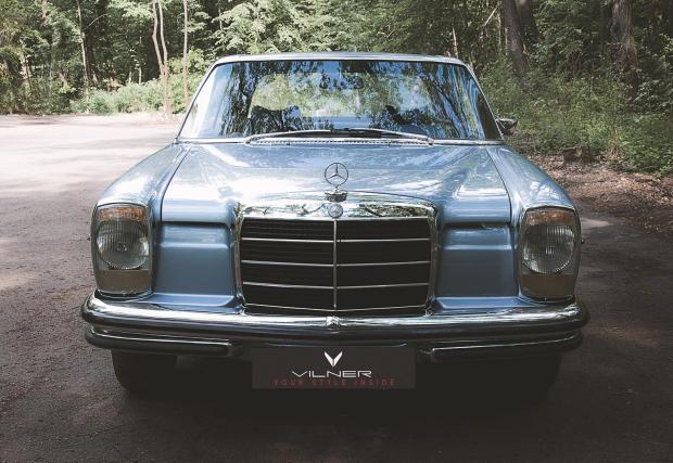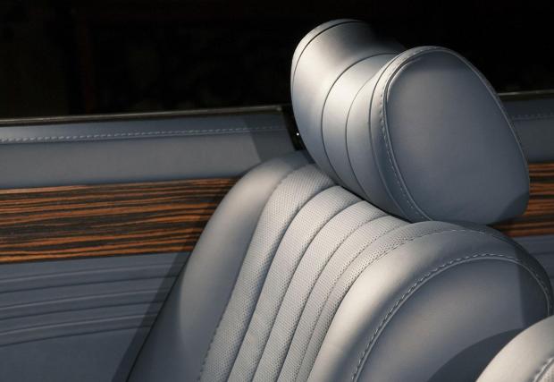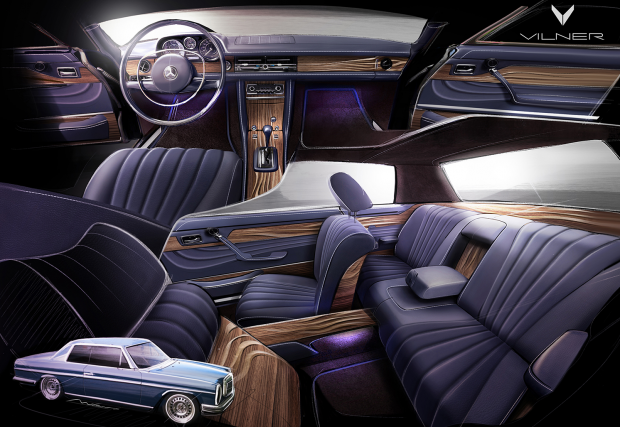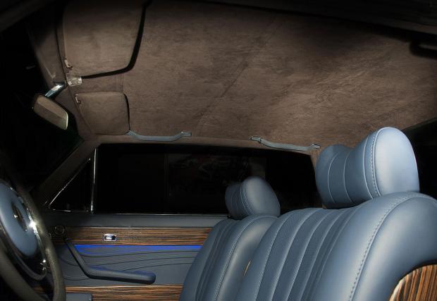 Комбинацията от специфично перфорирания лексан със сребристите безели на тонколоните, с изобилието от заобикалящите ги фурнир и синя кожа, създава уникална класическа атмосфера с леки стиймпънк нотки. Същото синьо се изпъчва и от LED ивиците монтирани в пода, вратите и дори тавана на колата. Самият таван пък е покрит със сива перфорирана алкантара, като дупчиците не са случайни. „Използвахме перфориран материал, за да се доближим присъствието и максимално до оригиналната кожена тапицерия,“ казва Атанас Вилнер. В контраст, подът на този Mercedes е кафяв, а салонът основно покрит със синя кожа.