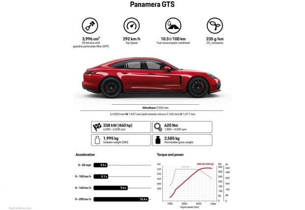 Случаят с Panamera GTS e идентичен. Автомобилът ползва дефорсирана версия на 4-литрвия битурбо V8, който тук генерира 460 к.с. и 620 Нм, като изпускателната система дори е снабдена с филтър за твърди частици. С него Pana GTS ускорява от 0-100 км/ч за 4,1 сек, а 0-200 прави за 15,4. Комбито Sport Turismo e също толкова бързо до сто, а максималните скорости на двете версии са съответно 292 км/ч и 289 км/ч.