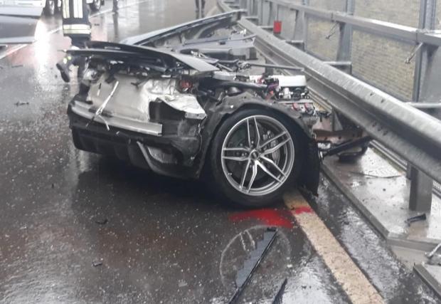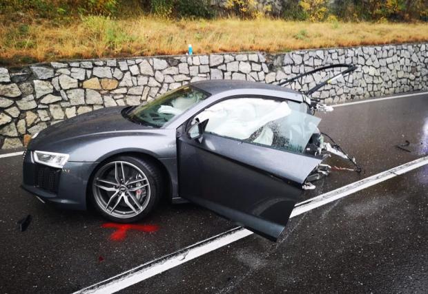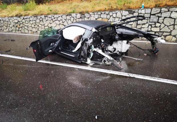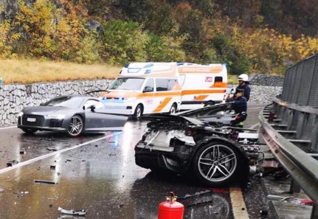 Конкретна причина за катастрофата не се споменава. На снимките микробусът не изглежда сериозно засегнат, за разлика от германската суперкола, която буквално е разполовена - десетцилиндровият двигател и задната ос са се отделили от кокпита. За щастие клетката на водача, подсилена с въглеродни влакна, е останала цяла, което вероятно е спасило живота му.